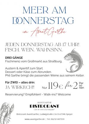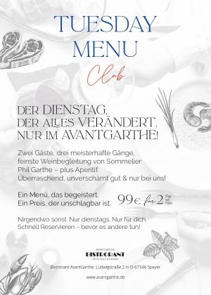 Seit Juni 2024 begrüßen wir Sie herzlich zu einem aufregenden Konzeptwechsel von Restaurant AvantGarthe zu AvantGarthe Bistrorant. Wir laden Sie ein, mit uns die köstliche französische Bistroküche zu entdecken, die Sie direkt in die sonnigen Straßen Südfrankreichs entführt.
